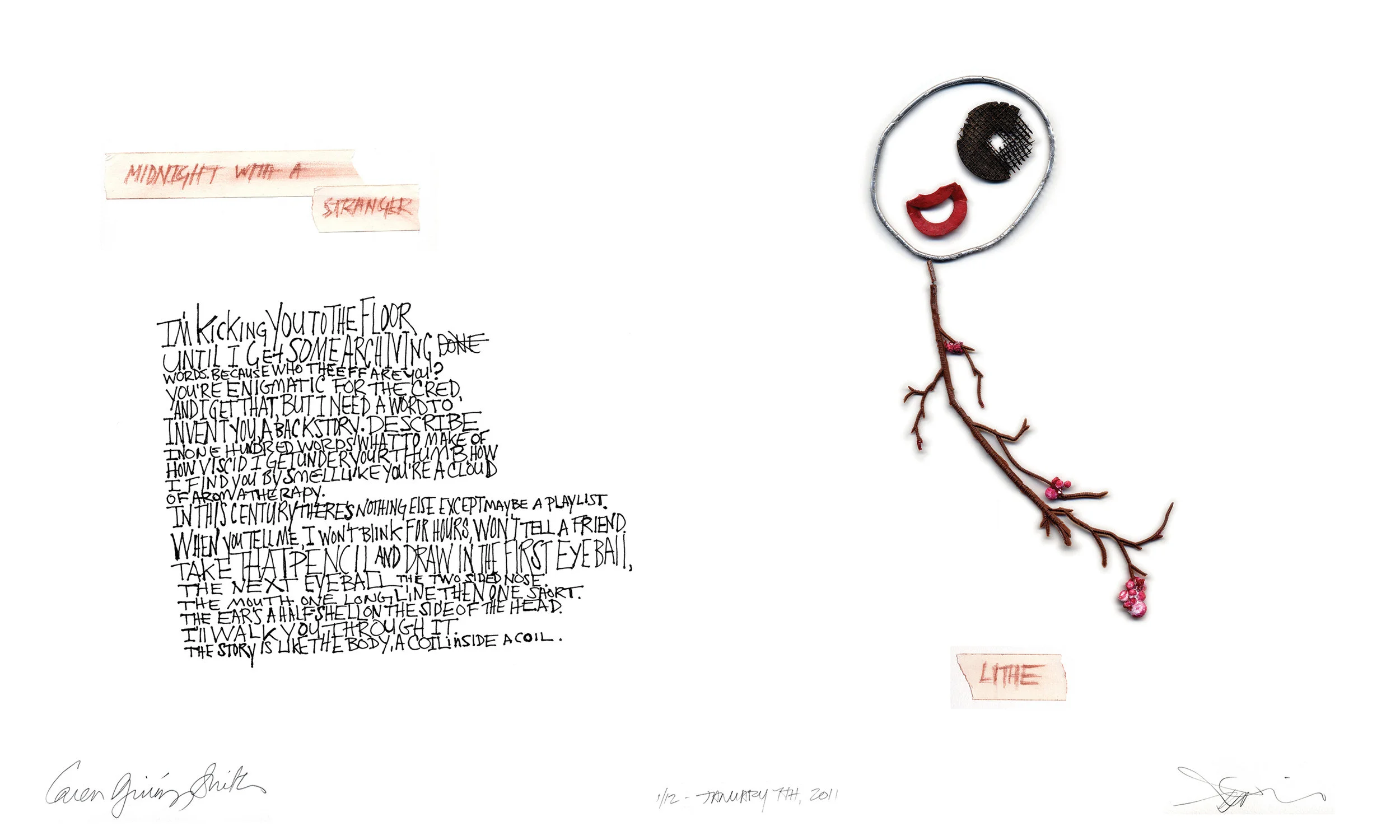 I collaborated with the poet Carmen Giménez Smith on the dis_assemblage project to produce a series of thirty page, spreads. Carmen wrote in an imagined voice for each character and I then re-inscribed the text in my hand. We exhibited these works in various venues and published them in experimental art and literary journals.